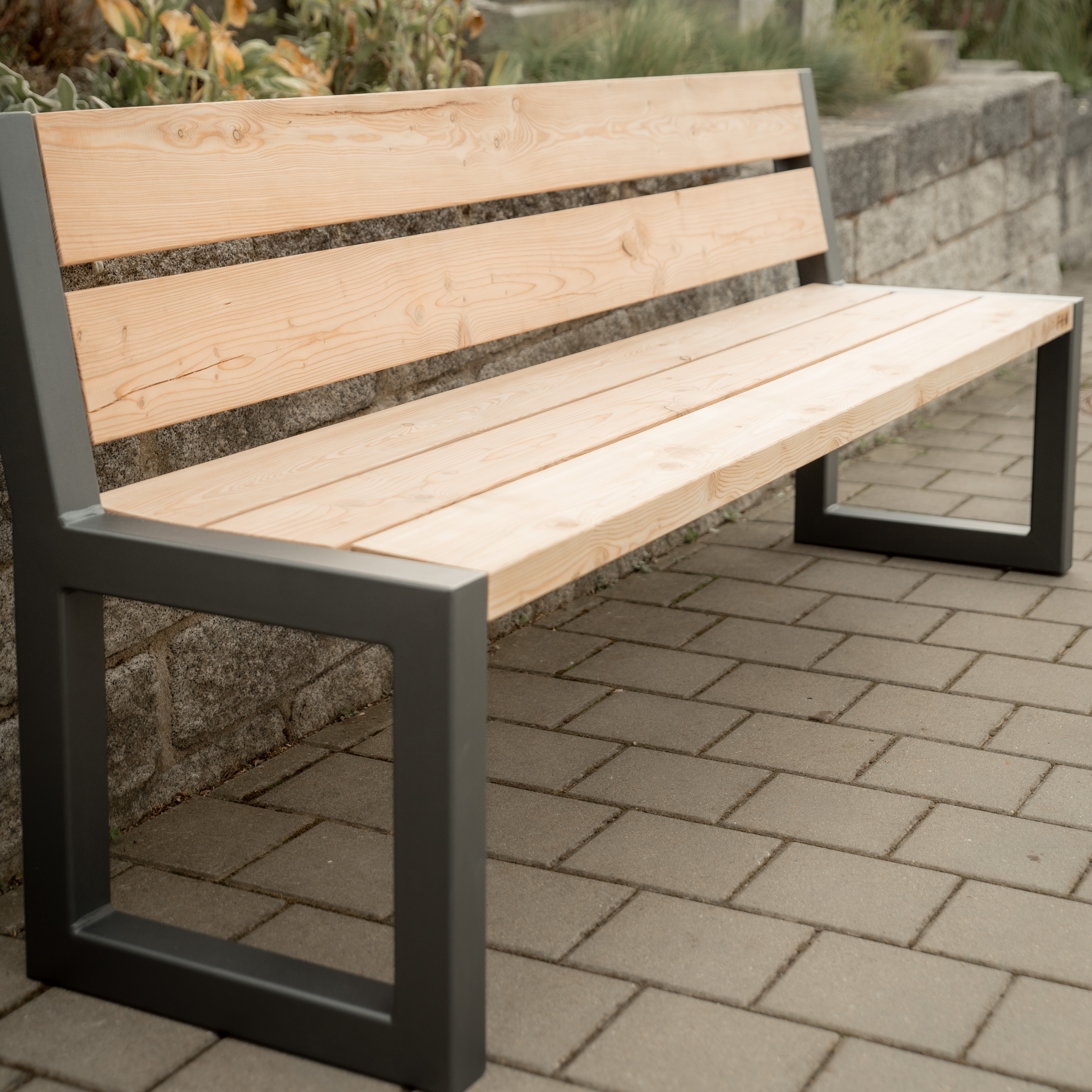 Die Bank Quattro mit Lehne besticht durch modernes Design. Die Seitenteile aus Rechteckrohren wurden feuerverzinkt und pulverbeschichtet. Die Sitzfläche und Lehne besteht aus 140 mm x 42mm Lärchenholzdielen. Alle Verschraubungen sind aus Edelstahl.